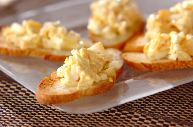 トーストしたフランスパンと、ホタテ、ゆで卵、らっきょうの相性を楽しめるカナッペのレシピ。鮮やかな色味でパーティーメニューにもぴったりです。おつまみにもよさそうですね。