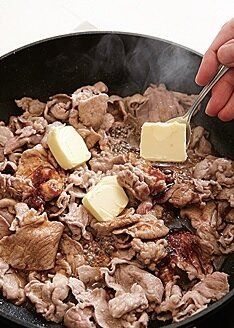フライパンにオリーブ油を中火で熱し、豚肉を入れ、肉の色が変わるまで炒める。[A]、バターを加え、バターを溶かしながらからめる。