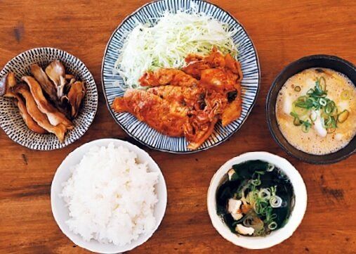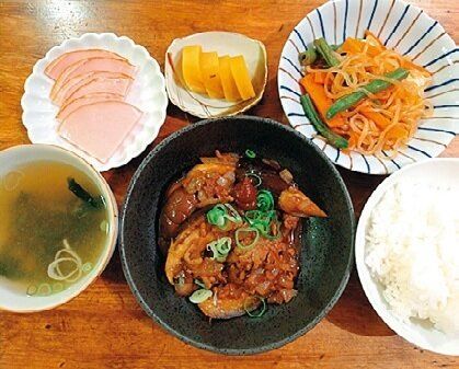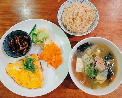 冷蔵室の半端野菜を入れた具だくさん豚汁。おかずは作り置き。