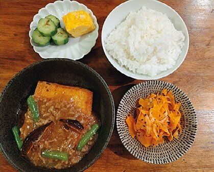 ご飯が何杯でも食べられる麻婆なす。副菜は、作り置き&開封しただけ。