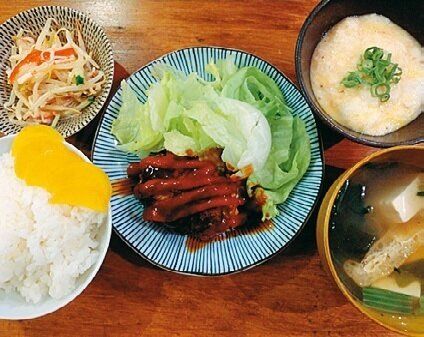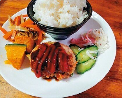 作り置きのハンバーグ。みそ汁は、昨日の残りに冷凍ほうれん草をプラス。