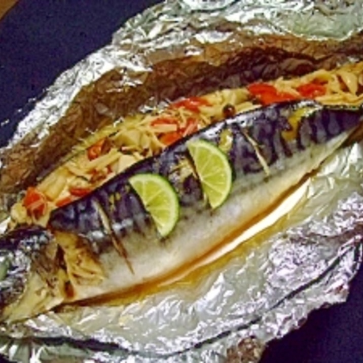 丸ごと塩さばのキノコ詰めホイル焼き~すだち風味で~
