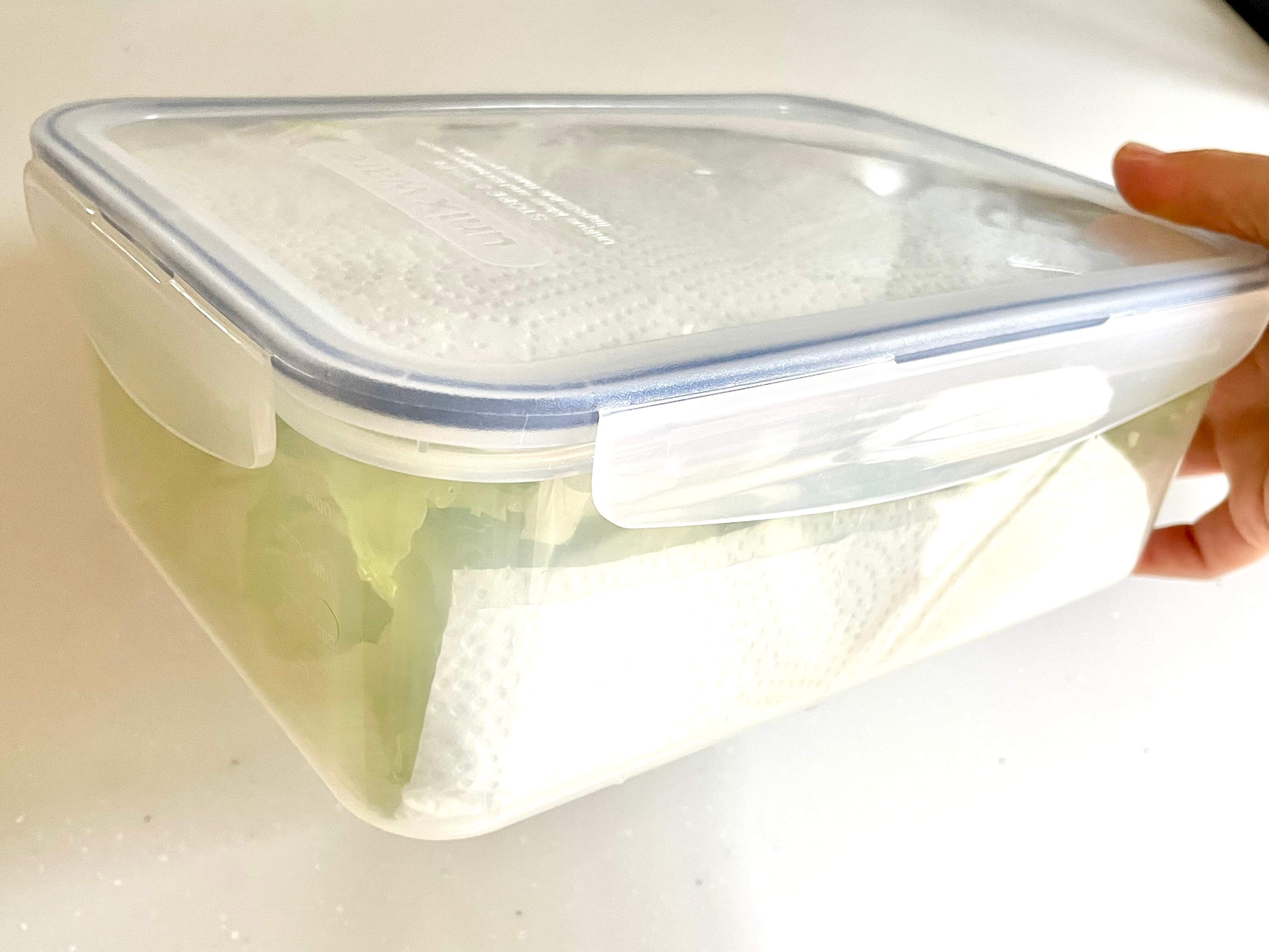 (3) 大きい保存容器にキッチンペーパーを敷いたところへ入れ、キッチンペーパーでふたをして野菜室で保存する。