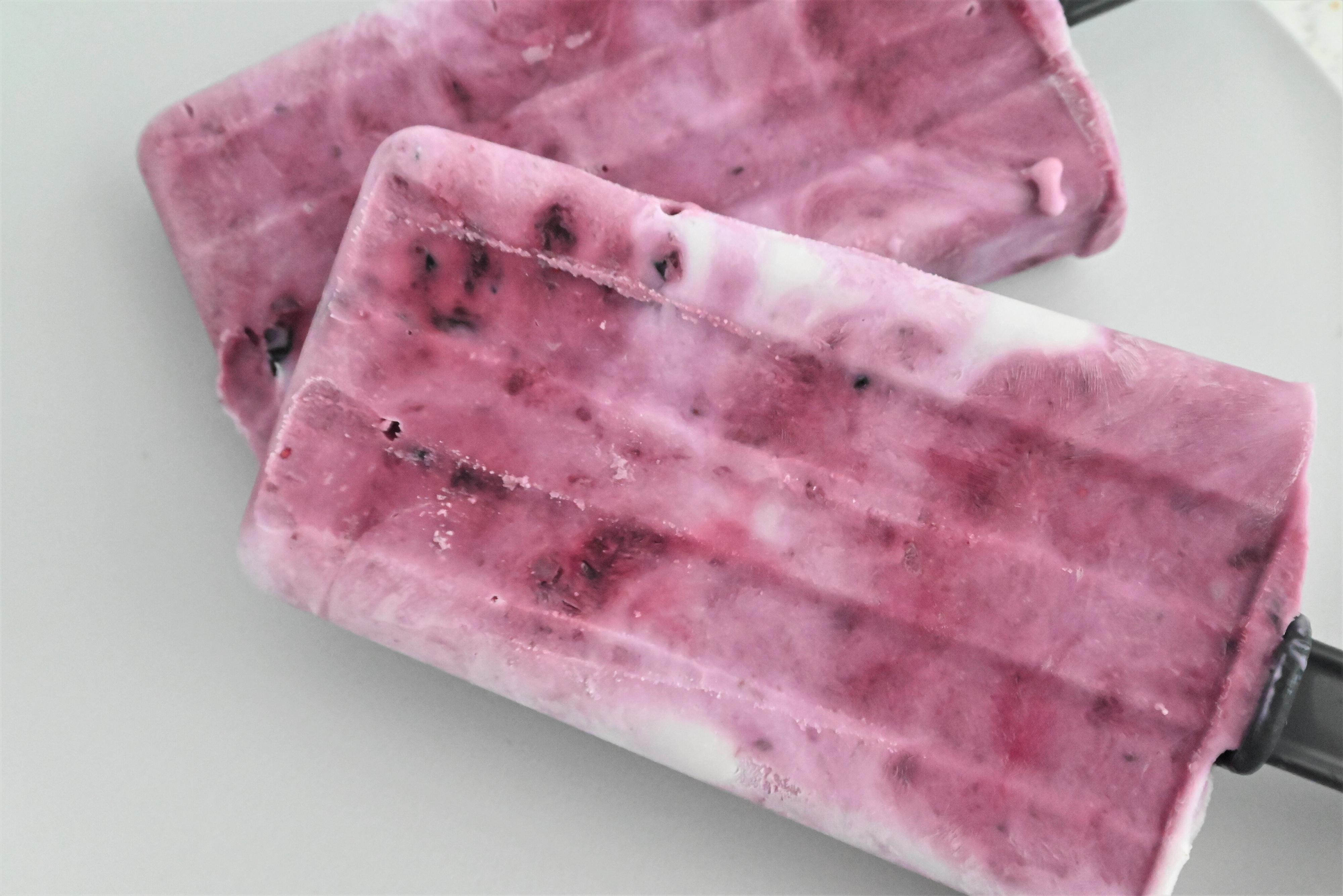 レンジ加熱で冷凍ブルーベリーをジャムにして作るアイスのレシピです。
