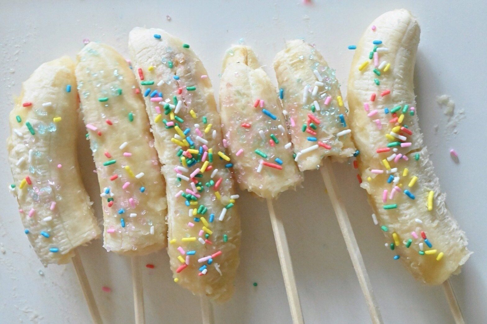 (1)バナナの皮をむき、半分に折って割りばしを刺す。
