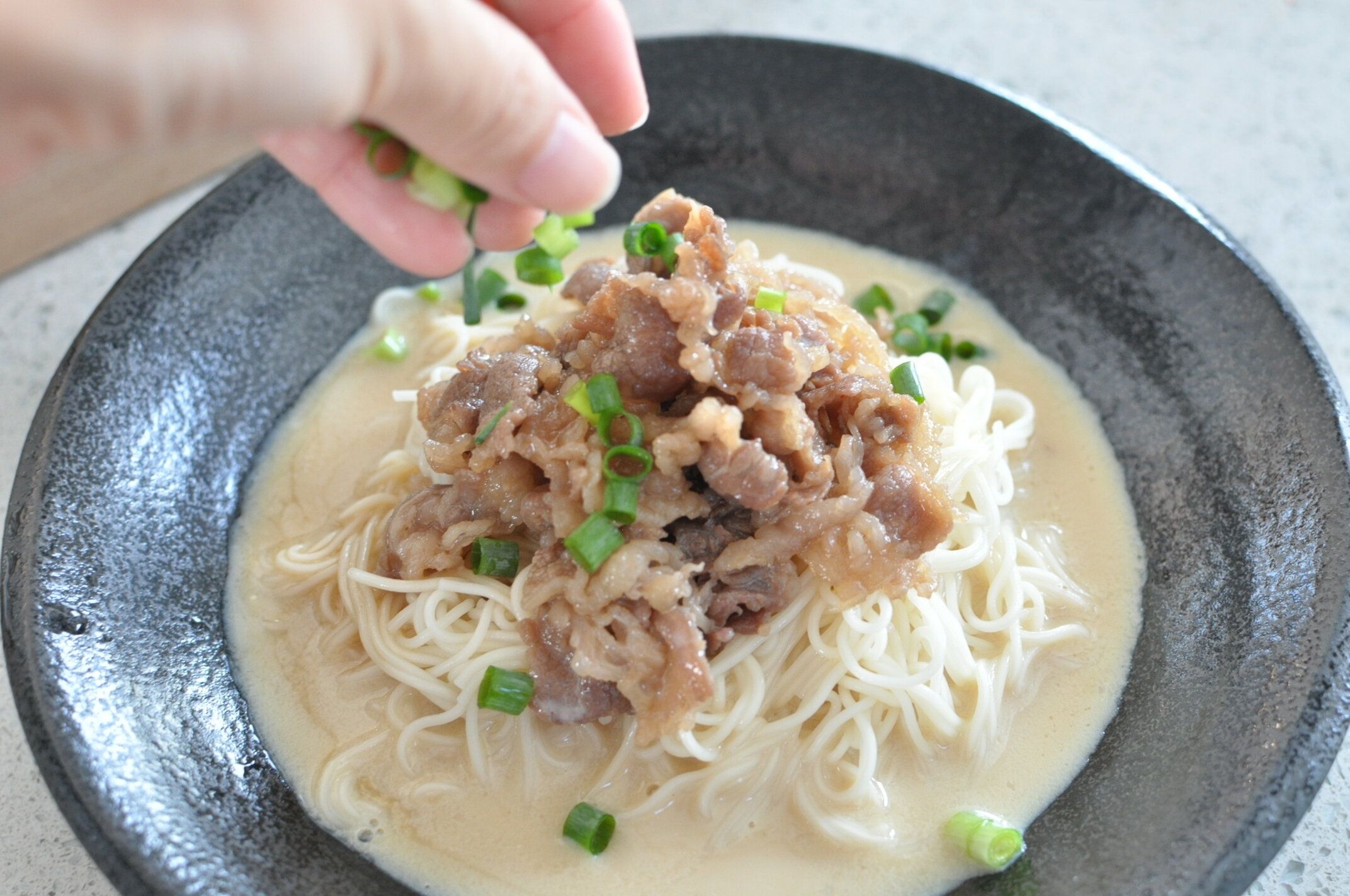 かけ汁をかけて、薬味のねぎをふります。