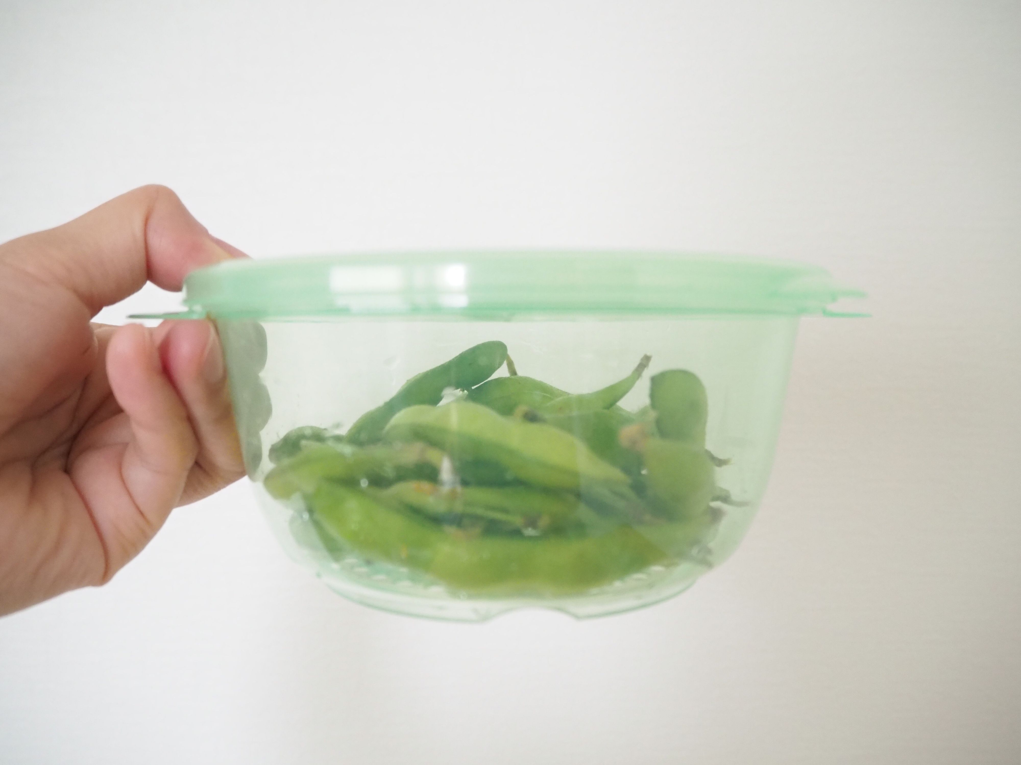 どれくらい簡単に調理ができるのか、実際に使ってみたいと思います。まずはえだ豆をザルに入れて洗い、フタをします。入れる量の目安は100gです。