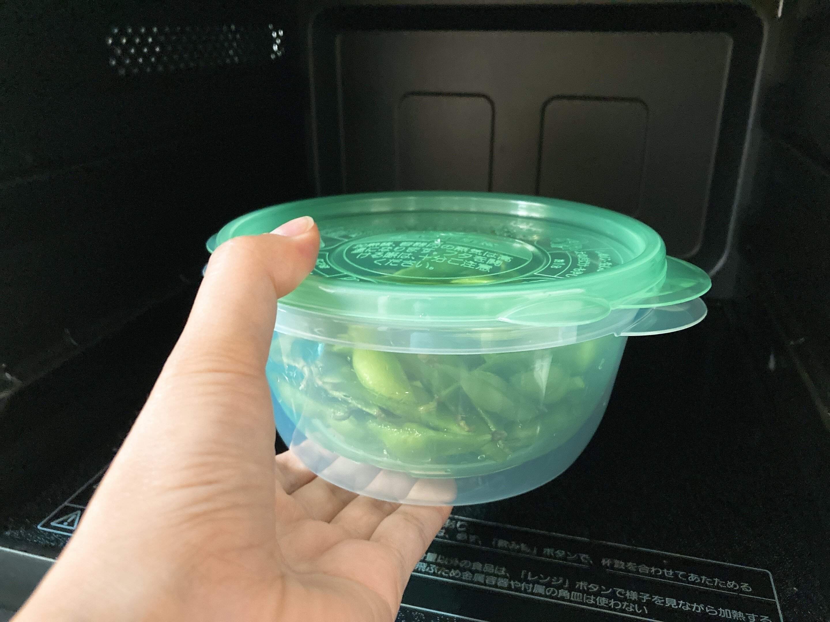 それをそのまま容器に重ね、あとは500wで2分30秒加熱するだけ。説明書きによると、えだ豆の水分で蒸すため、水を加える必要もないとのこと。
