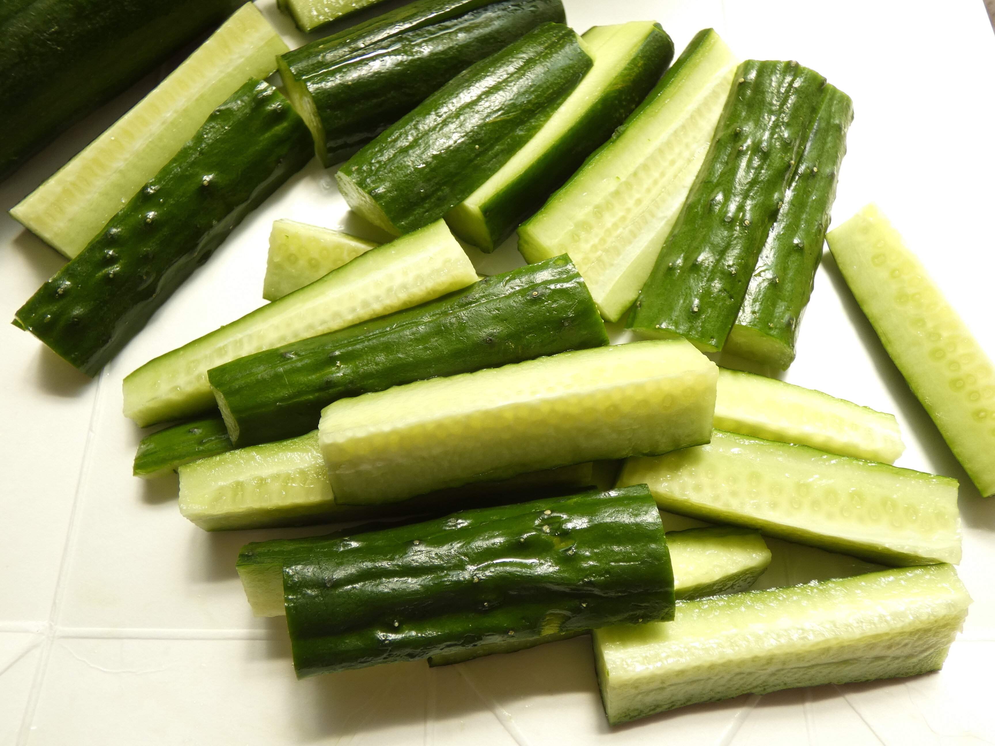 1.キュウリは長さを3等分にし、縦に4等分にします。