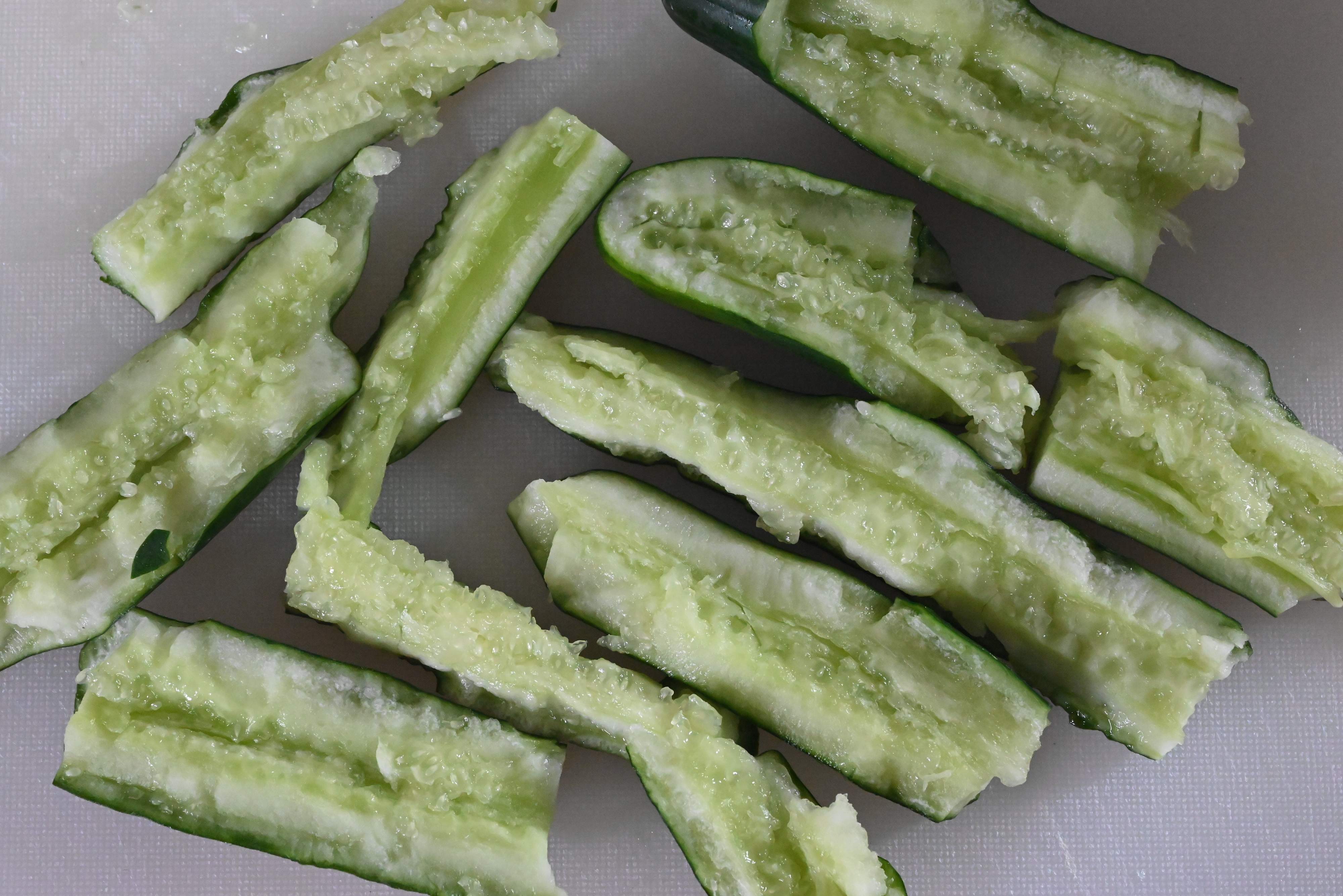 (1)きゅうりをめん棒で叩いて、食べやすい大きさに割り、キッチンペーパーで水気を抑える。