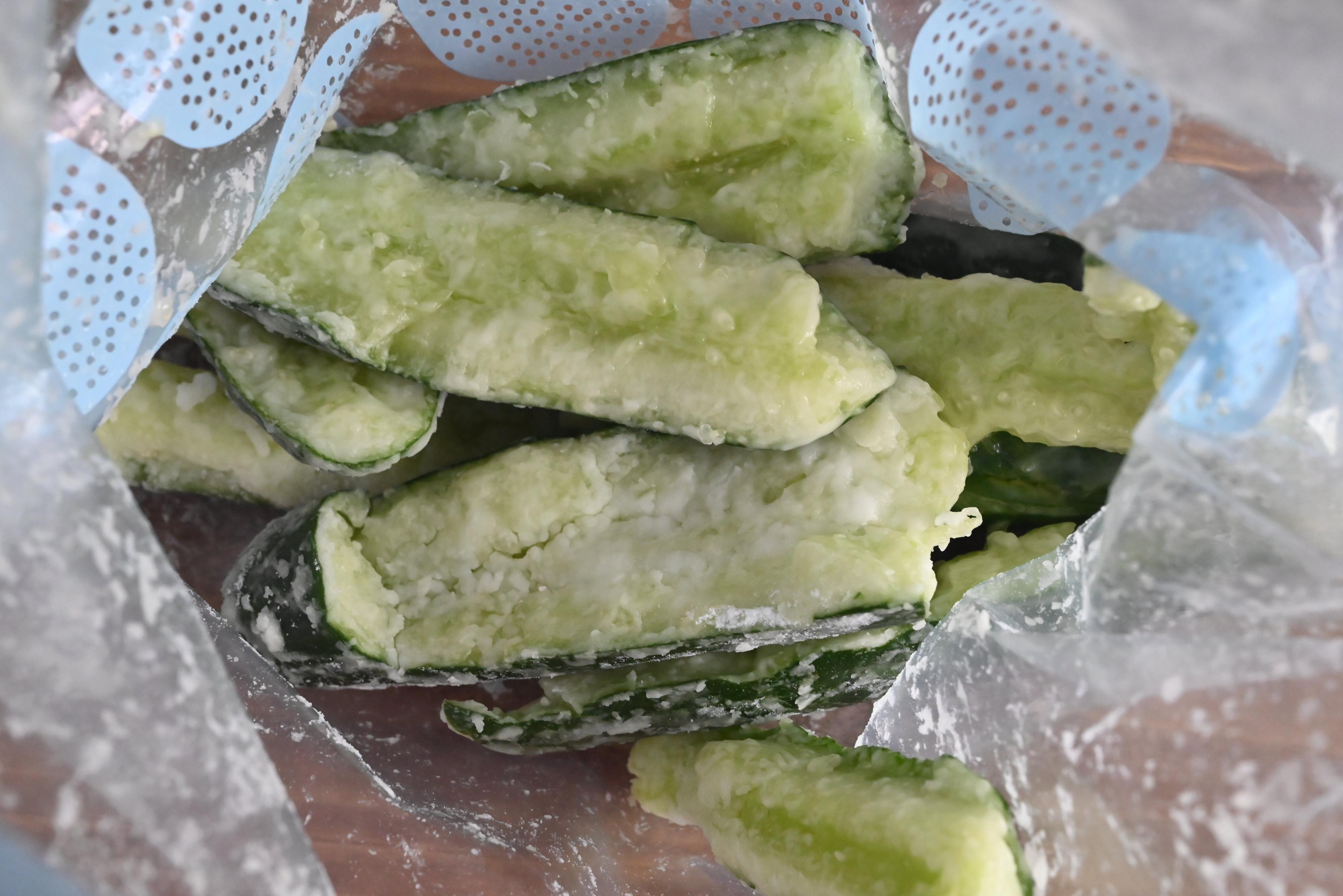 (2)食品用ポリ袋にきゅうり、鶏ガラスープの素、ガーリックパウダーを入れてふる。