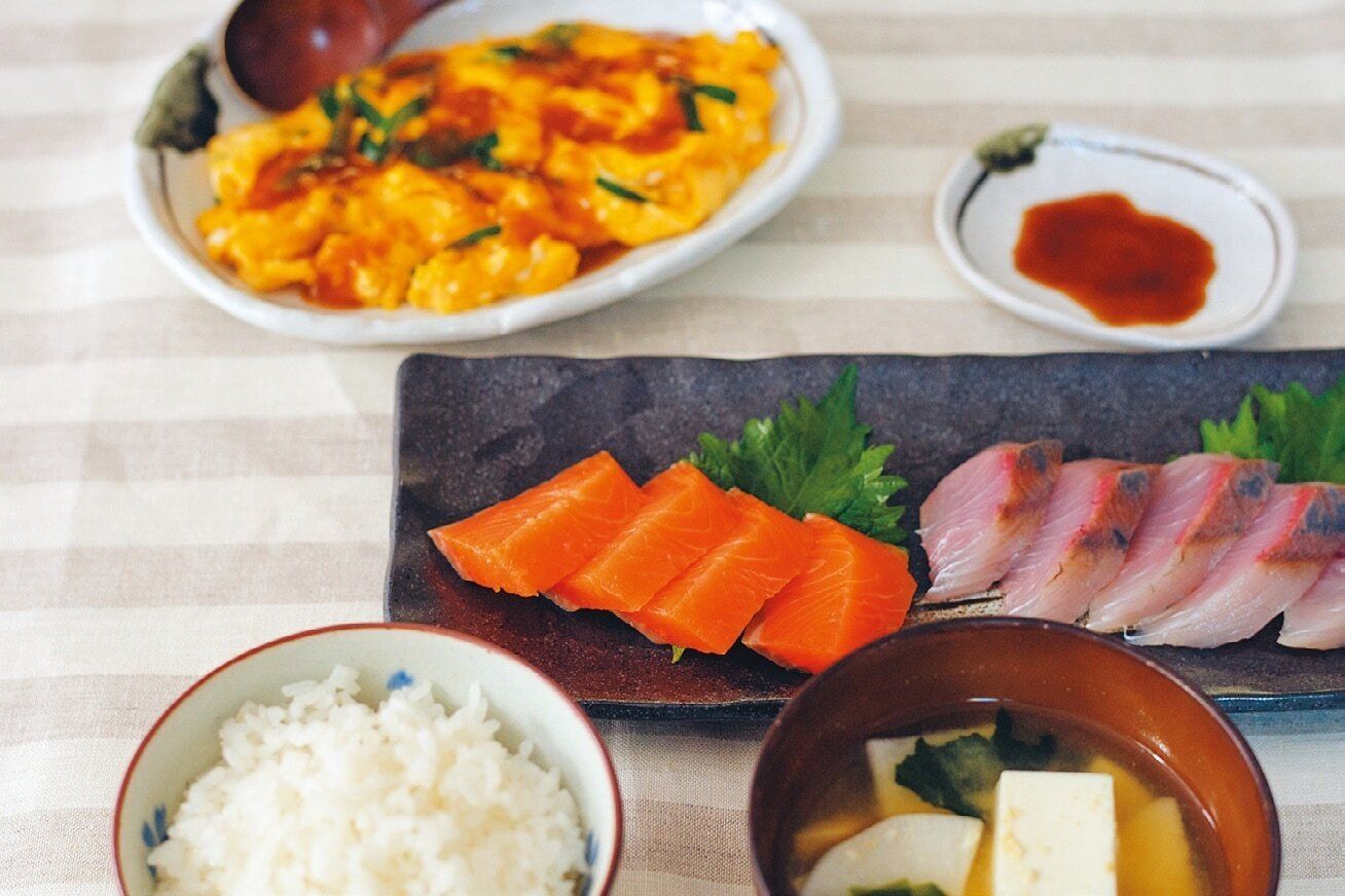 土曜日に鮮魚店で旬の魚2種類を買うのが習慣。「以前はよく回転ずし店に行っていたけど、安くておいしい魚を知ってからは刺し身献立が楽しみに!」。早めに使いたい豆腐やにらをみそ汁と副菜に。