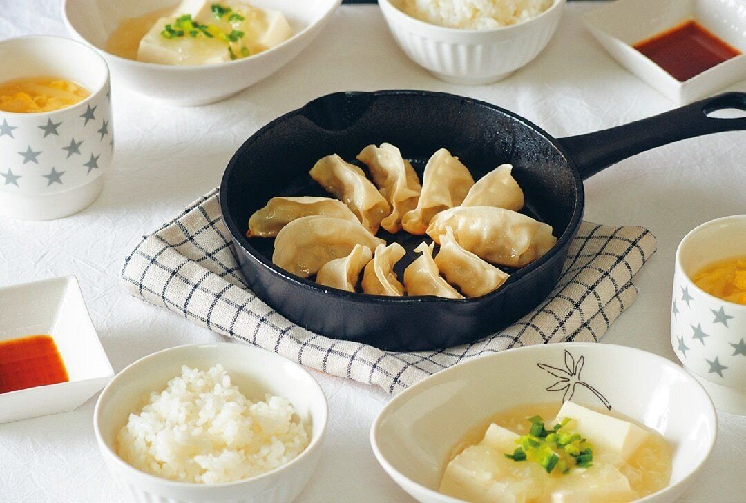 あまり手間をかける時間がない日は、ドラッグストアでお買い得のチルド餃子がお役立ち。スキレットに並べて焼けば見栄えも豪華に!副菜はひき肉なしの塩麻婆豆腐でさっぱりと。