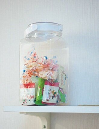 おやつは小分け包装のファミリーパックを買い、いろんな種類をミックスして容器に入れて駄菓子屋さん風に。毎日3個ずつ、どれにしようか選ぶのも楽しい♪