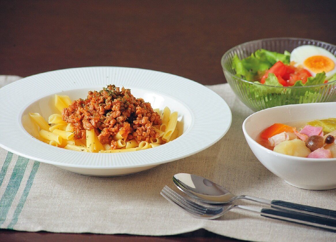 早ゆでペンネに冷凍ひき肉&玉ねぎで即席ボロネーゼに。さらに葉もの物野菜がいたむ前にサラダとポトフにして使い切りを。子どもも喜ぶ、超早なお助けメニューです。