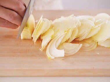 玉ねぎは、食感を残したいのでみじん切りではなく薄切りに。できるだけ薄く切ると、火の通りが早く、味がしみ込みやすい。
