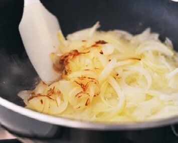 甘みを引き出すため、玉ねぎは焦がしぎみになるまでさわらず、放置するのがポイント。写真のような焼き色がついたらOK。