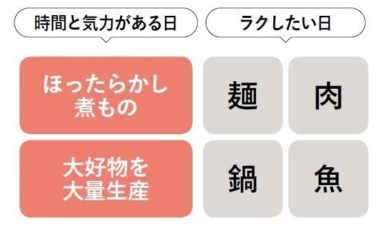 献立作りのポイントは、1週間のなかでの「時間と気力」がどれだけあるか考えて組み合わせること。「毎日ラクな料理だと似るから、時間と気力がある週末は子どもの好物をがんばって作ってます。その代わり翌週のべんとうや副菜に使えるように、多めに作って取りおきし、ラクします」。