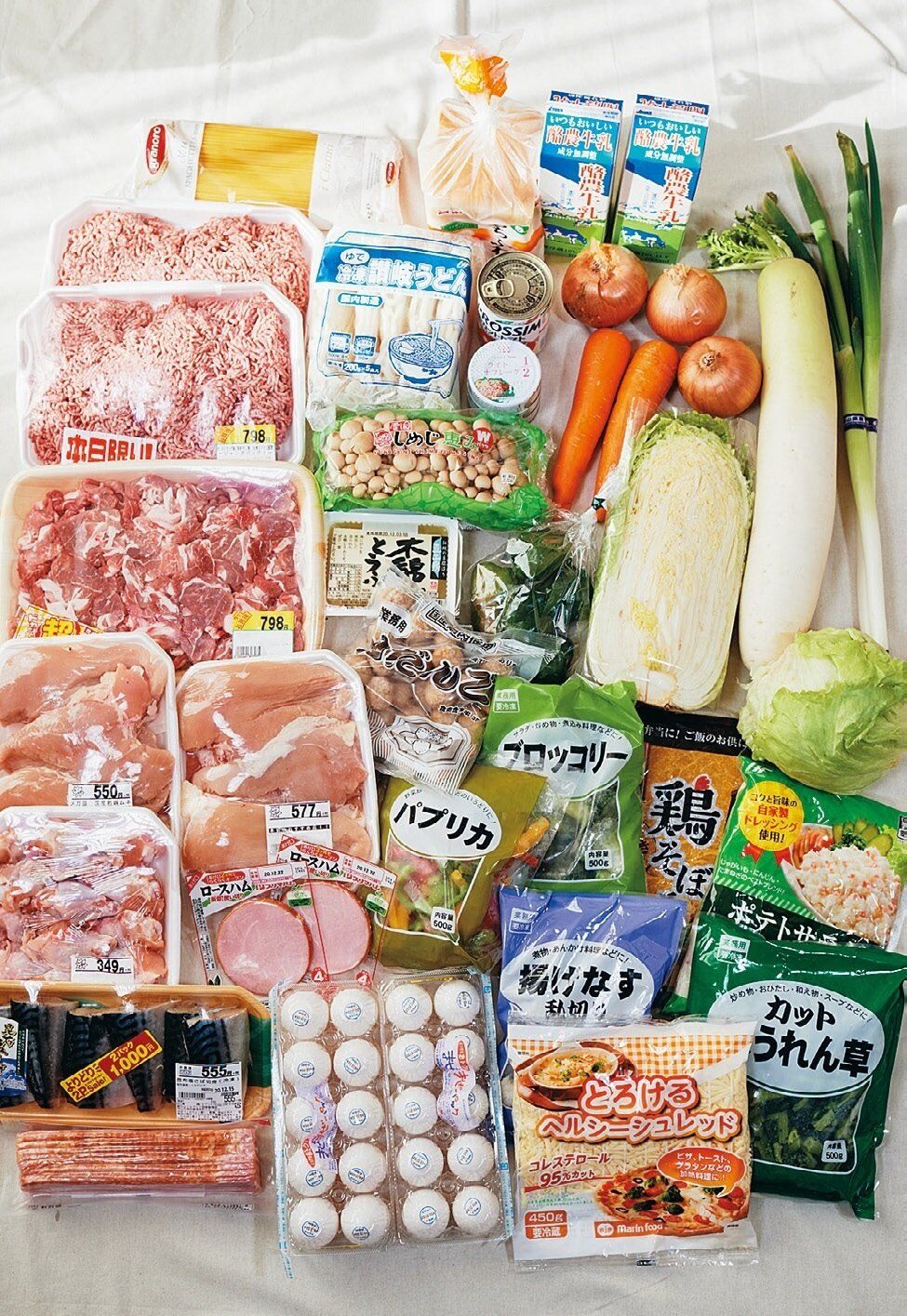 肉はまとめて買って冷凍するとおトクなので、ひき肉や鶏胸肉などよく使う肉は3~4kgまとめ買いがマスト。一方、「いたみやすい野菜はまとめて買わず、2~3日で使い切れる量を買いムダにしません。よく使う卵や牛乳は2パックずつ、冷凍食品も必ず買います」。