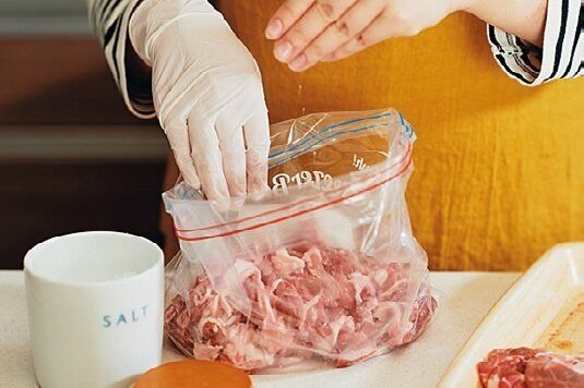 大量に買った肉は、1食分ずつ小分けにして塩だけふり冷凍室へ。「みそやしょうゆで味つけするより、塩だけのほうがどんな料理にも使えて便利」。
