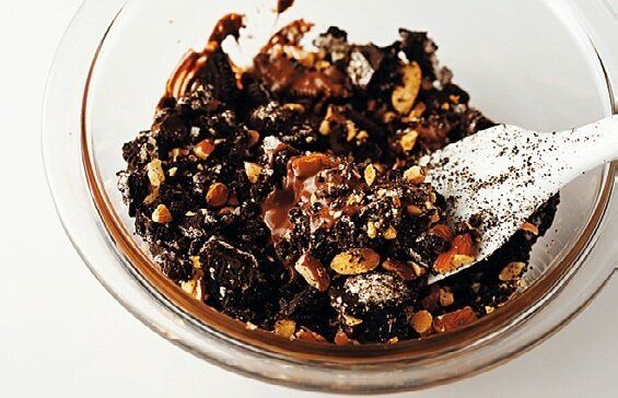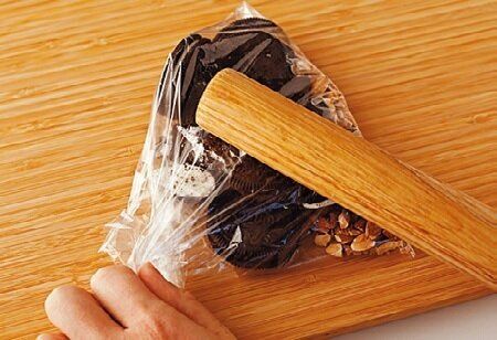クッキーとアーモンドを厚手のポリ袋に入れ、めん棒でたたいて砕く。