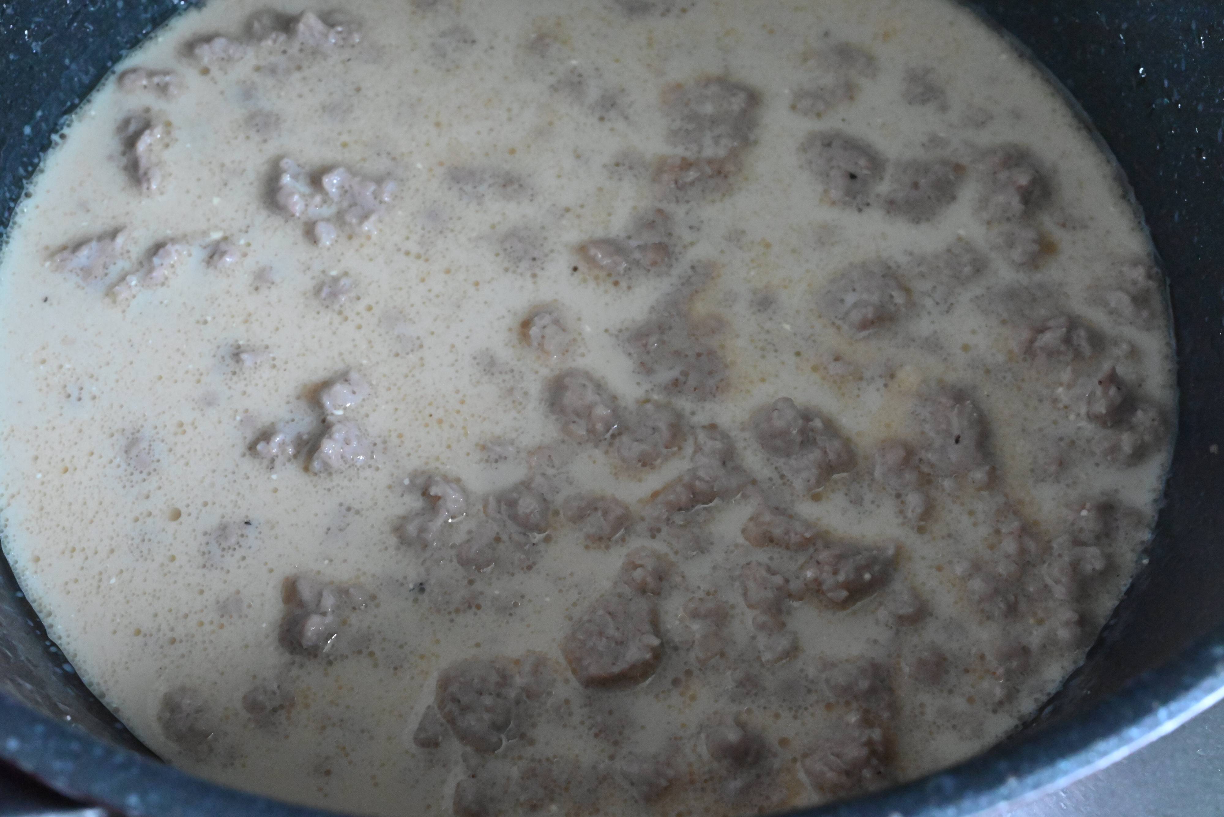 (4)豆乳、鶏がらスープの素、醤油を加えて沸騰する直前まで加熱する。
