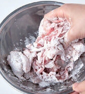 あらかじめ豚肉全体に片栗粉をまぶしておけば、酢豚は簡単!仕上げに水溶き片栗粉を入れなくてもとろみがつく。