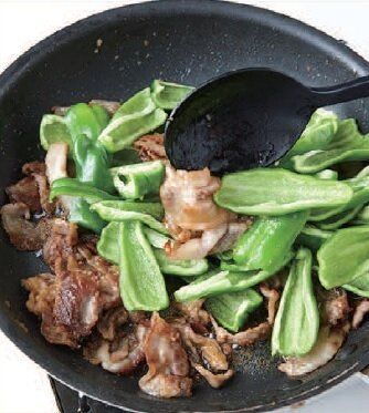 ピーマンはシャキッとした食感を味わいたいので、豚肉を香ばしく炒め、調味料をよくからめてから加えてさっと火を通せばOK。