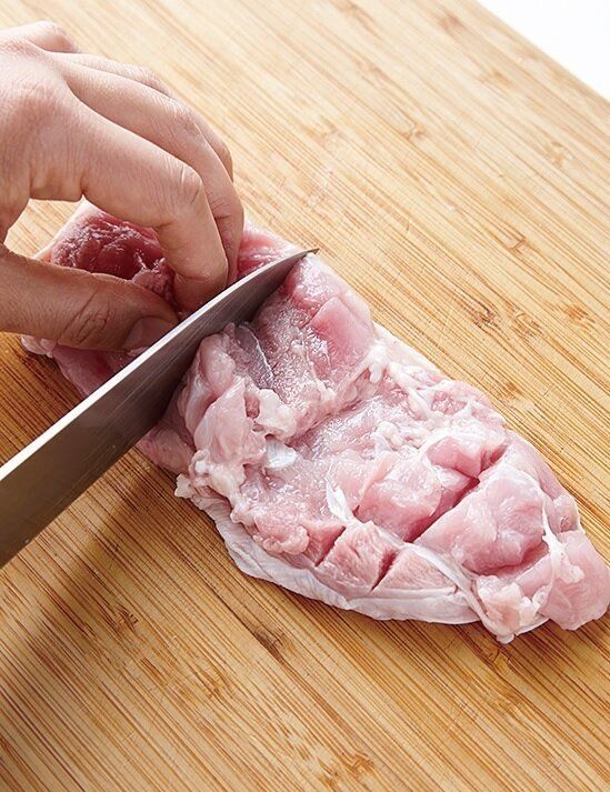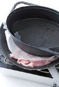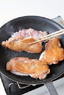 鶏肉は厚い部分に1cm間隔で肉の厚みの半分くらいまで切り込みを入れ、半分に切る。塩小さじ1/2、こしょう少々をふり、フライパンに皮を下にして置く。オーブン用シートをのせ、水を入れた鍋をのせる。強火にかけ、フライパンが熱くなってきたら強めの中火にして5分ほど焼く。