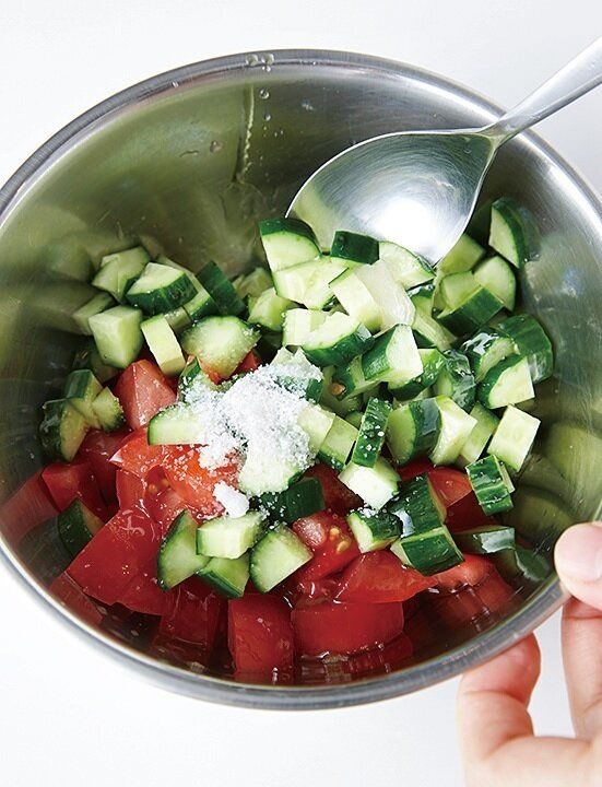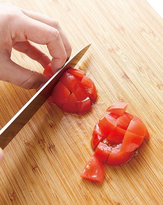 (2)のトマトときゅうりに[A]を加えて混ぜ合わせる。鶏肉を食べやすい大きさに切って器に盛り、ソースをかける。