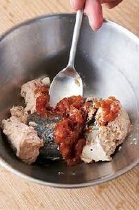 (2)さばを梅干しと混ぜる