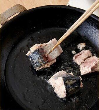 さば缶は皮目から焼いて、全体に軽く焼き目をつけると、臭みがなくなる。