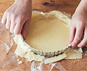 【2】袋を切り開いてタルト型に生地をかぶせ、袋の上から生地を押さえて型に敷き込む。