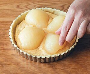 【2】タルト生地にアーモンドクリームを入れて広げ、洋梨をのせる。