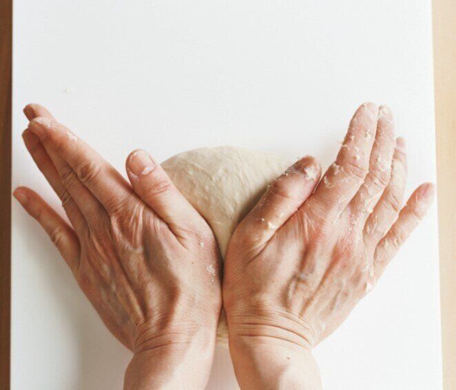 (4)まな板の上に生地を置き、手のひらで生地を奥へ押し出すように力を込めてこねる。