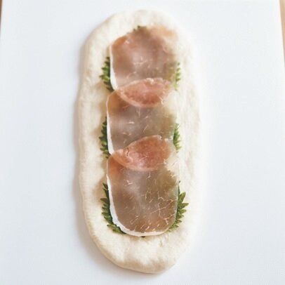 (9)めん棒で生地を10×25cm大にのばして、中心に青じそ、生ハムをのせる。