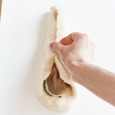 (12)とじ目を下にして、オーブンシートを敷いた天板に並べる。はさみで5カ所切り込みを入れながら生地を左右交互に広げ(d)、水にぬらして固く絞ったふきんを掛けて30分やすませる。