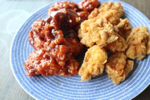 (3)揚げ油を中温(170℃)に熱して鶏肉を入れ、途中で返しながらこんがり焼き色がつくまで揚げる。油をきって器に盛り、五香粉をふる。