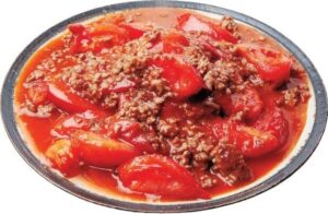 ■ パプリカ、しょうがを2分ほど炒め、取り出しておいたひき肉、しょうが以外の調味料を加えて炒める。
