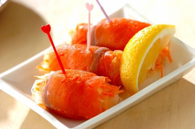 「ペッパーチーズ包み」「レンジキノコ巻き」「マリネ白ネギ巻き」の3種類を楽しめるレシピ。クリームチーズやエリンギ、白ネギなど、想像するだけでお腹が空いてくる組み合わせです。スパークリングワインのおともにいかがでしょうか。