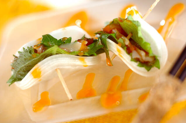クラゲのコリコリ食感や、梅肉のさっぱりとした味わいを堪能できそうなピンチョス。和食の副菜におすすめです!仕上げにマンゴードレッシングをかけてフルーティーに。爽やかな気分になれそうな一品です。