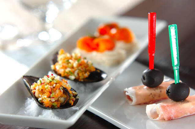 「ムール貝のエスカベッシュ」「サーモンのピンチョス」「生ハムのピンチョス」の3種を贅沢に楽しめるレシピです。そのまま盛り付けるだけで、おしゃれな一品になりそう。おつまみや前菜・副菜にぴったりで、ワインとの相性もよさそうです。