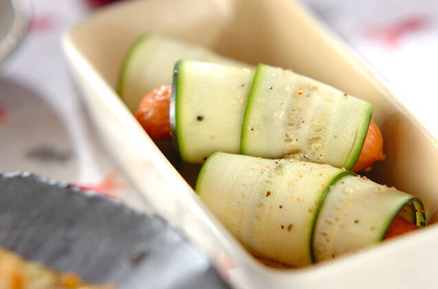 薄切りにしたズッキーニをソーセージにくるっと巻いて、ピンチョス風に仕上げるレシピ。お好みのドレッシングとあわせていただきます。彩りも鮮やかで、おつまみにぴったり。約5分で作れる手軽さもうれしいポイントです。