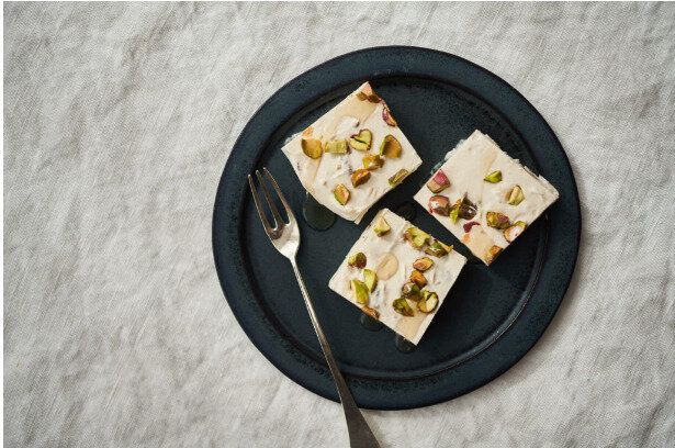 ほのかなラムレーズンの風味と、ピスタチオの食感が楽しいひんやりスイーツのレシピです。アイスづくりとは異なり、何度も空気を含ませる必要はありません。すべての材料を混ぜたら、冷凍庫に一晩入れっぱなしでOKなので、手間も時間もかかりません。