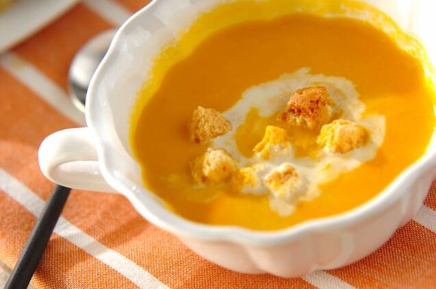 ニンジンと白ネギをすりつぶしてつくった、スープレシピです。ほっと一息つきたくなるような、安心感のある一品。まろやかな味わいが、最後に浮かべた生クリームとクルトンによく合います。