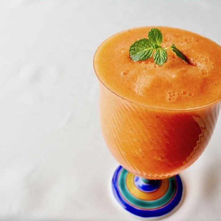 トマトと赤パプリカの色味が、華やかな印象のスムージー。トマトは甘みの強いものを使うのがおすすめ。バニラアイスをプラスしているので、まろやかな味わいを楽しめます。