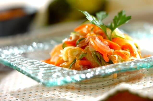甘味と塩味のバランスの虜になりそうな、サラダのレシピです。シンプルな味つけで、素材のおいしさを堪能できそう。約5分で完成するので、あともう一品プラスしたい時にもおすすめですよ。