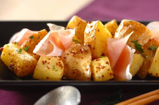 サクッと揚げたジャガイモに、生ハムの旨みをプラスしたフライドポテト。こしょうやマスタードの味つけが、全体のアクセントになりそうです。洋食の副菜におすすめで、ビールとの相性もよさそうですね。