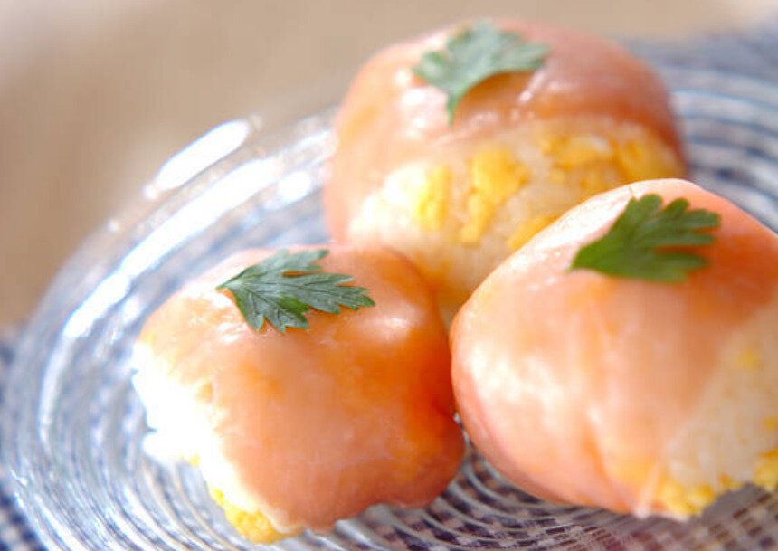 炊きたてご飯と生ハムの相性バツグンの、生ハムのひとくちにぎり。炒り卵をレンジ調理すれば、火を使わずに約20分で完成します。イタリアンパセリを飾ると3色そろって彩りも豊かに。一口サイズで食べやすいのもうれしいポイントで、パーティーメニューにもおすすめです!