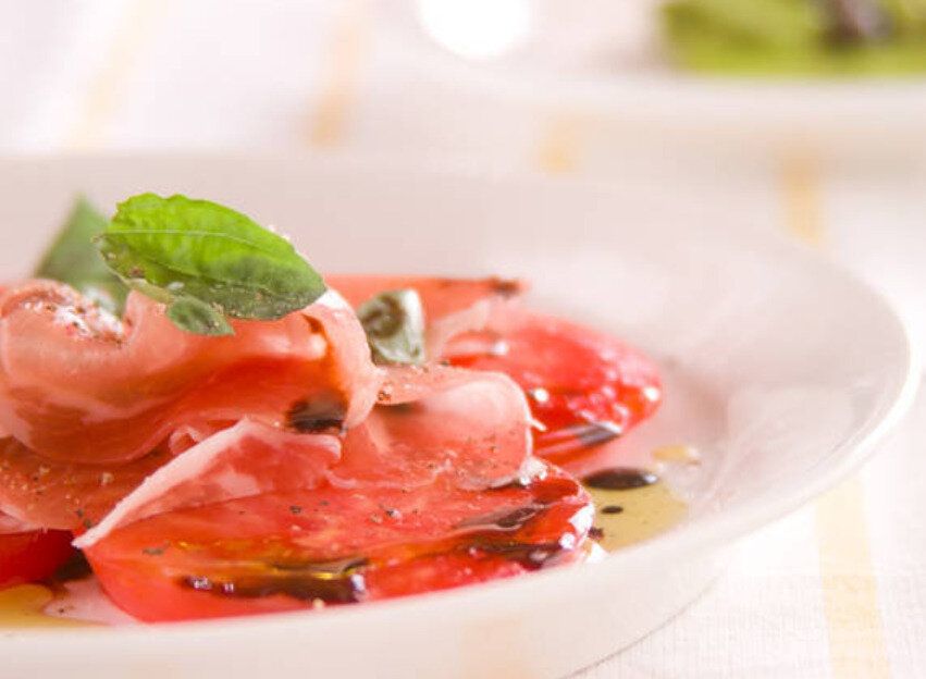 生ハムとトマトの色味が鮮やかなカルパッチョのレシピ。調理時間は約10分で、オリーブオイルとバルサミコ酢を使って本格的な味わいに仕上げます。バジルの代わりにレタスを使っても◎。バルサミコ酢は温めることでまた違ったおいしさを堪能できますよ。